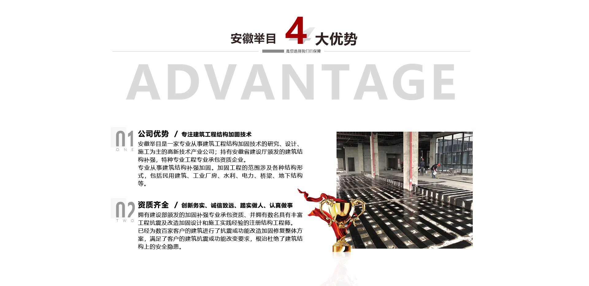 安徽舉目工程加固有限公司是一家專業(yè)從事建筑工程結(jié)構(gòu)加固技術(shù)的研究、設(shè)計、施工為主的高新技術(shù)產(chǎn)業(yè)公司,成立于2012年。持有安徽省建設(shè)廳頒發(fā)的建筑結(jié)構(gòu)補(bǔ)強(qiáng),特種專業(yè)工程專業(yè)承包資質(zhì)企業(yè)。專業(yè)從事建筑結(jié)構(gòu)補(bǔ)強(qiáng)加固。加固工程的范圍涉及各種結(jié)構(gòu)形式,包括民用建筑、工業(yè)廠房、水利、電力、橋梁、地下結(jié)構(gòu)等。公司依托高校土木建筑學(xué)院、省建筑科學(xué)研究機(jī)構(gòu)專業(yè)從事建筑結(jié)構(gòu)加固、檢測、鑒定、設(shè)計、施工、公司擁有建設(shè)部頒發(fā)...